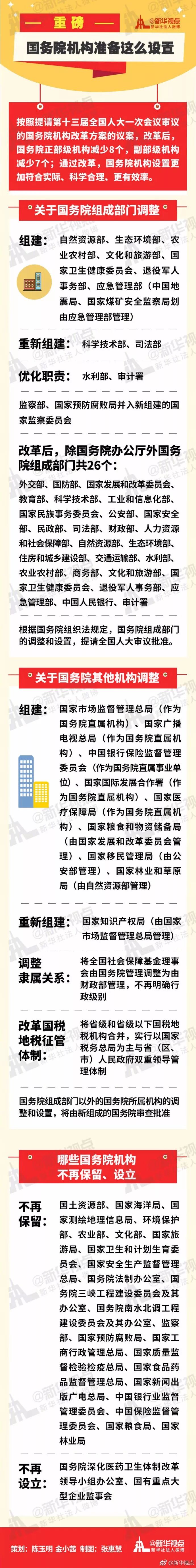按照提請(qǐng)第十三屆全國(guó)人大一次會(huì)議審議的《國(guó)務(wù)院機(jī)構(gòu)改革方案》,改革后,國(guó)務(wù)院正部級(jí)機(jī)構(gòu)減少8個(gè),副部級(jí)機(jī)構(gòu)減少7個(gè)。具體改革方案請(qǐng)看長(zhǎng)圖: